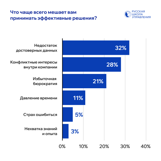 Русская Школа Управления провела исследование и выяснила, что большинство управленцев работают в условиях нестабильных процессов, перегружены оперативными задачами и испытывают сложности с принятием решений — не из-за страха ошибок, а из-за системных барьеров внутри бизнеса.